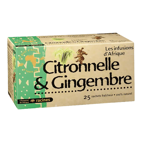 L'Infusion d’Afrique Aromes Divers - Citronnelle & Gingembre, en boîte de 25 sachets, est un mélange authentique et naturel conçu pour offrir une expérience gustative apaisante et revigorante. Inspirée des traditions africaines, cette infusion associe les arômes frais de la citronnelle à la chaleur piquante du gingembre pour un moment de bien-être unique.